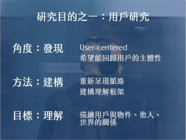 理想中,執行用戶研究的基本出發點,是 user-centered 用戶中心,從「發現」的角度去尋找並回歸用戶在真實生活處境的主體性,藉由重新呈現脈絡、建構理解框架,而由此瞭解並描繪在用戶的生活世界脈絡裡,用戶與物件、他人、世界的關係。