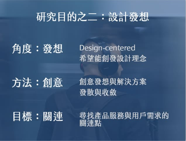 在產品與服務的產業領域當中,用戶研究有時候是為了更特定的目的:我們需要透過用戶的研究與生活情境的觀察,幫產品服務找到創意發想的火花、創新設計的收斂方向,也為產品服務的設計找到用戶需求的生活故事論述根基。